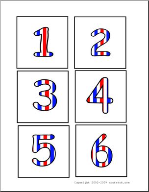 Red, white and blue numbers from 1-31, as well as matching stars. Great for making a July calendar or for playing math games. Six to a page.