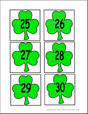 Green shamrocks hold the numbers from 1-31, as well as matching math symbols. Great for making a March calendar or for playing math games. Six to a page.
