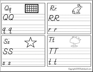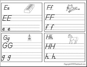 Upper and lower case writing. With a picture to match each letter. These print beautifully on cards for practice pages, or they can be enlarged for classroom posters.