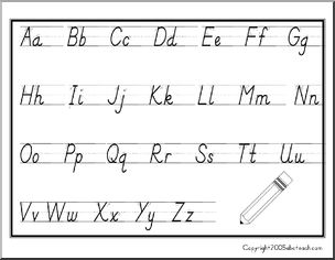 A one page chart illustrating the alphabet in manuscipt and cursive lowercase zb-style font letters with handwriting lines.