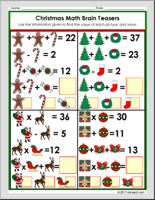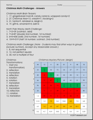 Five fun math activities with a Christmas theme: 1. Find the value of each picture, 2. If/then wacky addition, 3. Find the number that doesn’t belong, 4. Geometry transformations, 5. Mystery Picture.