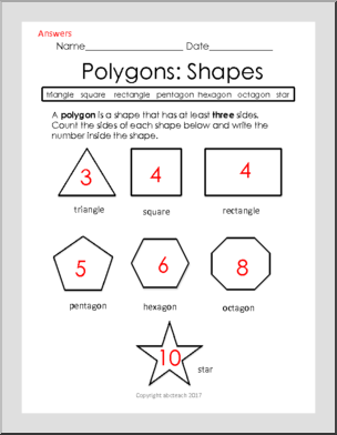 Teach the definition of a polygon, shapes, and number of sides. Polygons mentioned: triangle, square, rectangle, pentagon, hexagon, octagon, and star.