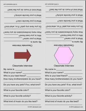Students pair up by matching shapes on cards, interview each other, and write the answers to questions on the cards. A great back to school activity.