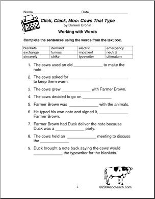 Use this ‘Book: Click, Clack, Moo Cows that Type (primary, elementary)’ printable worksheet in the classroom or at home. Your students will love this ‘Book: Click, Clack, Moo Cows that Type (primary, elementary)’. Reinforces vocabulary and comprehension for Doreen Cronin’s popular story of life on a rather unusual farm.