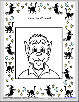 Fun coloring book with pictures of a vampire, witch, skeleton, warewolf, and more Halloween-themed characters.
