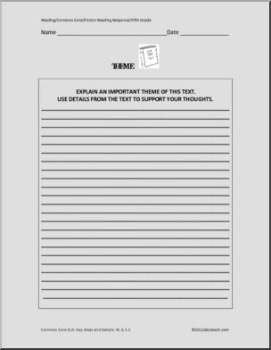 This fiction reading response is a five page template addressing the common core reading standards for fifth grade literature; Key Ideas and Details. This response can be used as a book report or as a response to a shorter piece of text. Provides detailed demonstrations of comprehension. Common Core: ELA: RL.5.1-3