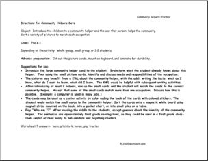 Introduce the children to a community helper and the way that person helps the community. Sort a variety of pictures to match each occupation. (Use alone or with other Community Helpers in this series)