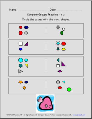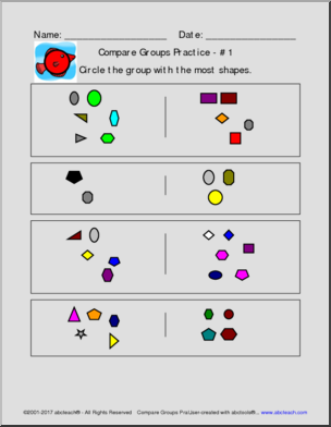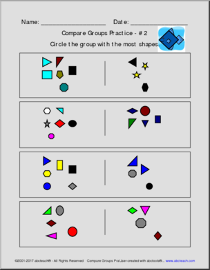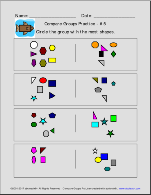 10 pages of comparison practice. Circle the group with the most shapes. Created with our abctools Math Worksheet Generator. CC: K.CC.C.6
