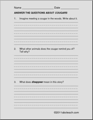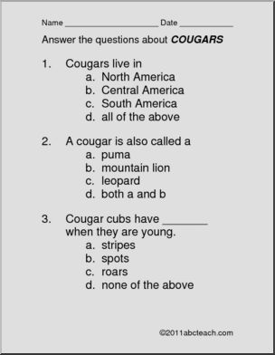 A very easy reading comprehension selection about cougars. This is one of a complete set on “big cats” from our member site. It is followed by 3 multiple choice questions and 3 questions that require brief written responses.