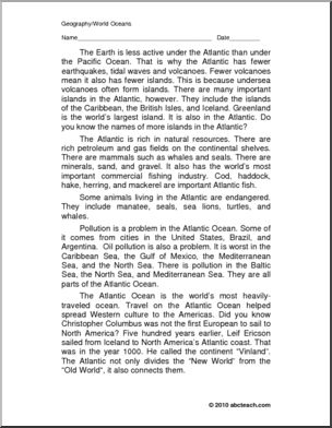 This reading on the Atlantic Ocean is part of the Oceans of the World series. Includes a labeled b/w world map; multiple choice, short answer and map skill questions; and answer key.