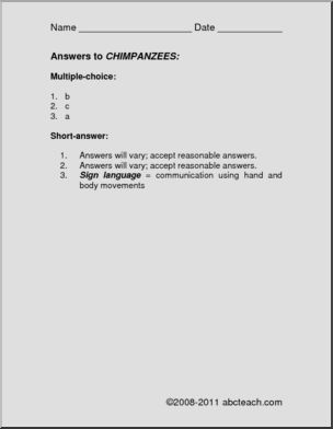 A very simple reading comprehension selection about chimpanzees is followed by 3 multiple choice questions and 3 questions that require brief written responses.