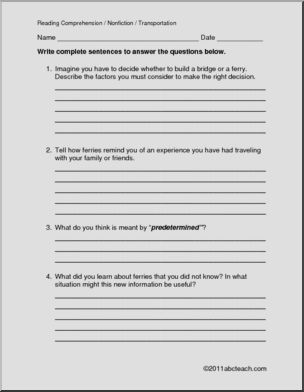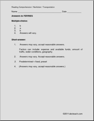 A 1 page reading comprehension selection, “Ferries” is a non-fiction informational article. It is followed by 3 multiple choice questions and 5 questions requiring short written responses.