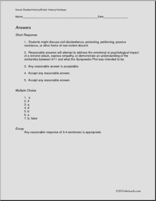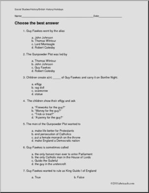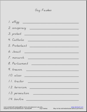 A two page reading comprehension on the historic event that is the origin of the British holiday, Guy Fawkes Day, aka Bonfire Night. Includes: short answer and multiple choice questions, a writing prompt, vocabulary list of related words, plus three abctool activities with vocabulary words.