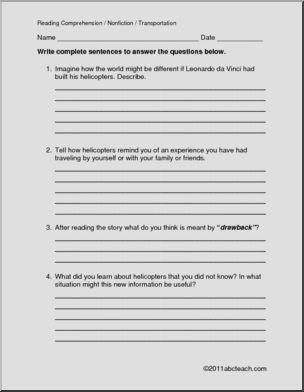 A 1 page reading comprehension selection, “Helicopters” is a non-fiction informational article. It is followed by 3 multiple choice questions and 5 questions requiring short written responses. One of a series on modes of transportation.