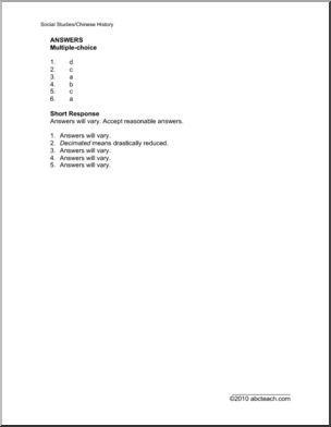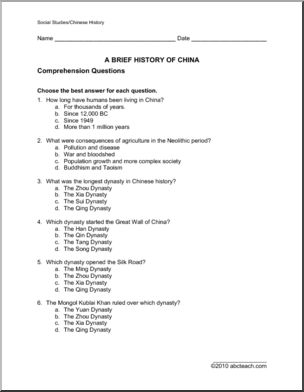A three page reading comp on the history of China with multiple choice and short response questions.
