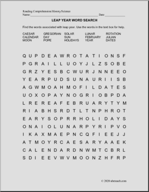 Updated: This one page nonfiction selection presents the history and reasons for February 29th. It is followed by 7 multiple choice questions, 5 questions that require brief written responses, and a word search.
