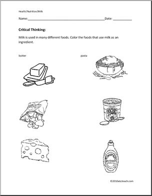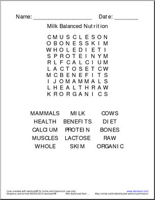 One page reading comp about the nutrition of milk with comprehension questions, critical thinking activity, vocabulary word search .