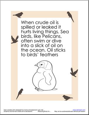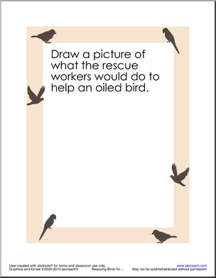 A booklet created with abctools with bird border about rescuing sea birds from oil. Drawing activity prompt.