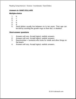 A one page selection about the invertebrate, sand dollar, followed by 5 multiple choice questions and 5 questions requiring a brief written response.