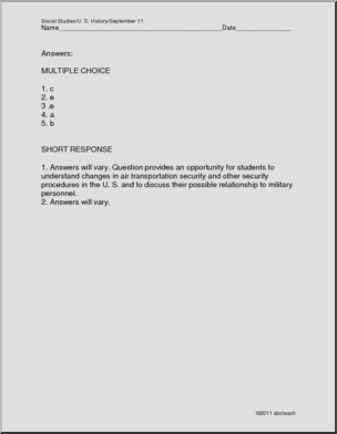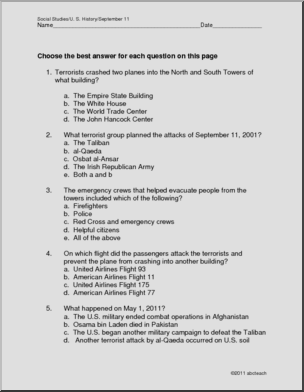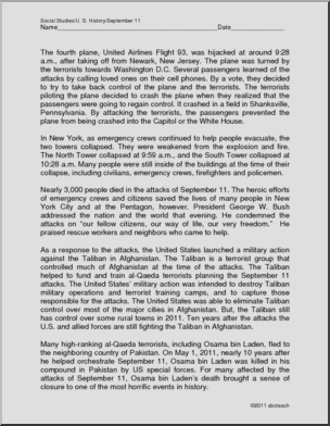 A two page reading comprehension text covering the events of September 11, 2001 and the U. S. response, with multiple choice and short answer questions.