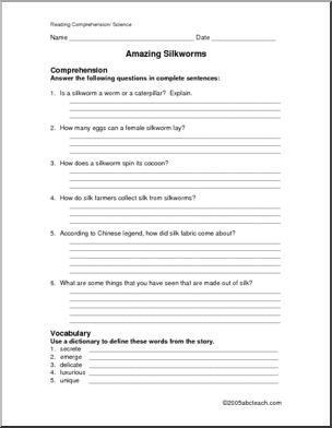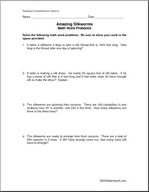 This extensive unit features a reading comprehension, vocabulary work, math word problems, and creative writing prompts, all on the topic of silkworms.