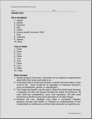 An illustrated two page explanation of the endocrine system with a set of completion, true/false, and short answer questions. Part of an abcteach series on systems of the human body and how our body works.