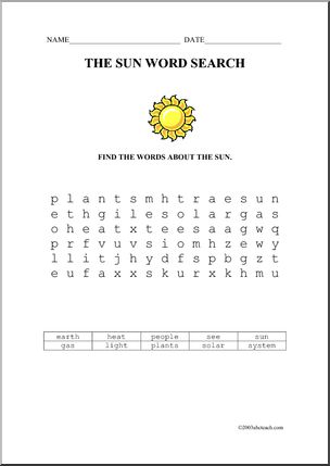 An informational reading comprehension about the sun and a word search.
