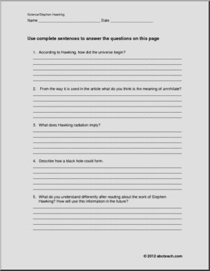 A two page overview of the theories of Stephen Hawking and there acceptance in modern science. Multiple choice and short answer sets are included, along with a writing prompt.