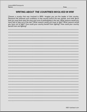 A two page text on how the participating countries in WWI became involved in the war. Includes a page of multiple choice and a page of short answer questions, as well as a writing prompt.