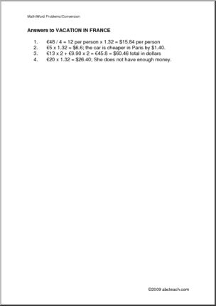 Conversion – Vacation in France (upper elem/middle) Word Problems