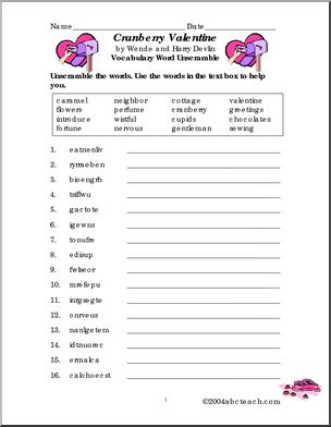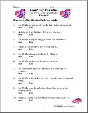 Use this ‘Book: Cranberry Valentine (primary)’ printable worksheet in the classroom or at home. Your students will love this ‘Book: Cranberry Valentine (primary)’. This unit helps develop comprehension skills and enhances the vocabulary found in Harry and Wendy Devlin’s story of a man who never got a Valentine…and his secret admirer.