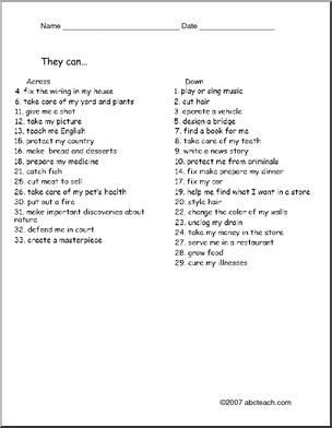 Crossword puzzle with professions vocabulary. Clues given as definitions of what a certain profession can do.