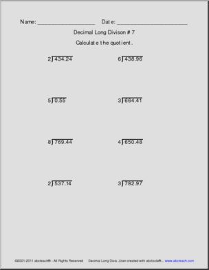 This Decimal Long Division Sets 7-9 (elem) Math is perfect to practice decimal long division skills. Your elementary grade students will love this Decimal Long Division Sets 7-9 (elem) Math. Three one page practice sets of long division problems with decimal points, 8 problems per page. Answer sheet included for each page.
