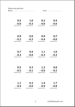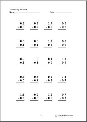 This Decimal Subtraction (set 4) Worksheet is perfect to practice decimal subraction skills. Your elementary grade students will love this Decimal Subtraction (set 4) Worksheet. Printable decimal subtraction worksheets, working on numbers up to 20. This is a five page workbook.