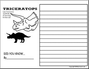 Four printable cards with graphics for writing facts about Triceratops, Brachiosaurus, Stegosaurus, and Tyrannosaurus Rex.