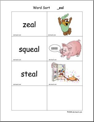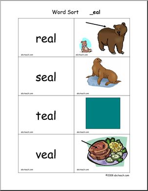 Use this ‘Word Sort Center: -eal Words’ printable worksheet in the classroom or at home. Your students will love this ‘Word Sort Center: -eal Words’. Cards with words and matching pictures for words ending in -eal; these can be used in matching games and word sort center activities.