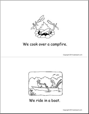 A black and white illustrated early reader booklet in the about camping.