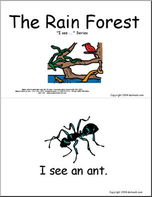 “I see an ant.” Color illustrations of animals native to the rain forest habitat.