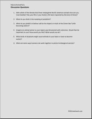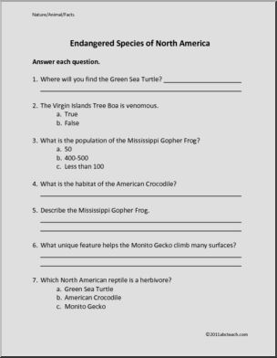 A one page color illustrated fact sheet featuring five endangered animals of North America (4 reptiles & 1 amphibian), plus a page of 6 discussion questions for upper elementary/middle school and a page of 7 short answer questions for elementary students. Also includes teacherÃs notes. Part of an abcteach series of fact sheets on endangered […]