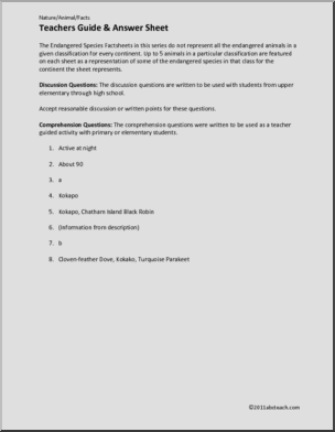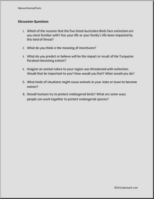 A one page color illustrated fact sheet featuring five endangered birds of Australia. Includes teacher’s note, a page of 6 discussion questions for upper elementary and middle school students and a page of completion questions for elementary students. Part of an abcteach series of fact sheets on endangered species.