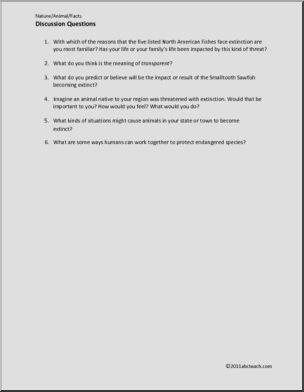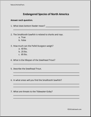 A one page color illustrated fact sheet featuring five endangered fish of North America, plus a page of 6 discussion questions for upper elementary/middle school and a page of 7 short answer questions for elementary students. Also includes teacherÃs notes. Part of an abcteach series of fact sheets on endangered species.
