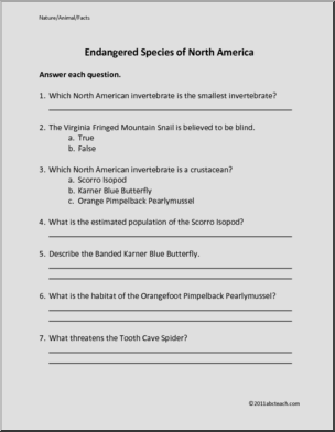 A one page color illustrated fact sheet featuring five endangered invertebrates of North America, plus a page of 6 discussion questions for upper elementary/middle school and a page of 7 short answer questions for elementary students. Also includes teacherÃs notes. Part of an abcteach series of fact sheets on endangered species.