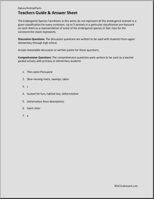 A one page color illustrated fact sheet featuring five endangered mammals of South America. Includes teacher’s note, a page of 6 discussion questions for upper elementary and middle school students and a page of completion questions for elementary students. Part of an abcteach series of fact sheets on endangered species.