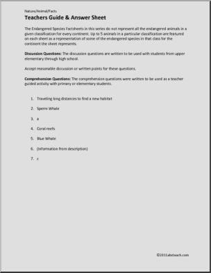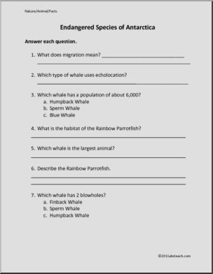 A one page color illustrated fact sheet featuring five endangered species of Antarctica. Includes teacher’s note, a page of 6 discussion questions for upper elementary and middle school students and a page of completion questions for elementary students. Part of an abcteach series of fact sheets on endangered species.