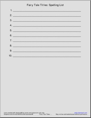 Use this ‘Spelling List: Fairy Tale Titles’ printable worksheet in the classroom or at home. Your students will love this ‘Spelling List: Fairy Tale Titles’. Ten fairy tales to learn to spell, a page for copying the titles, and a blank page for testing.