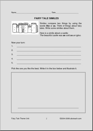 Use this ‘Poetry Prompts: Fairy Tales (upper elem)’ printable worksheet in the classroom or at home. Your students will love this ‘Poetry Prompts: Fairy Tales (upper elem)’. An introduction to some basic poetic structures, including alliteration, similes, and acrostics, using fairy tale themes.