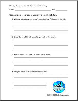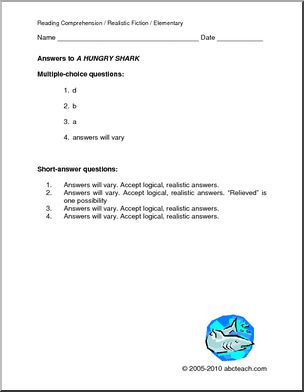 A 1 page realistic fiction piece,”A Hungry Shark” is followed by 3 multiple choice questions and 5 questions requiring short written responses.