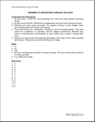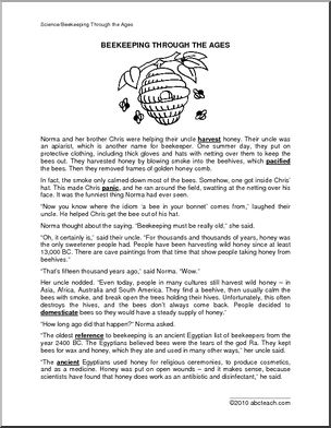 A two page story filled with factual information on the history and science of beekeeping, with reading comp, vocabulary, writing and math exercises.