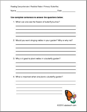 A 1 page realistic fiction story about a girl who loves butterflies is followed by 4 multiple choice questions and 5 questions requiring brief written responses.