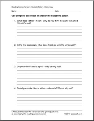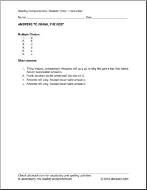 “Frank, the Pest” is a 1 page selection of realistic fiction. It is followed by 6 multiple choice questions and 4 questions requiring short written responses. This reading comprehension piece works alone or with Level 2, Unit 5 spelling.